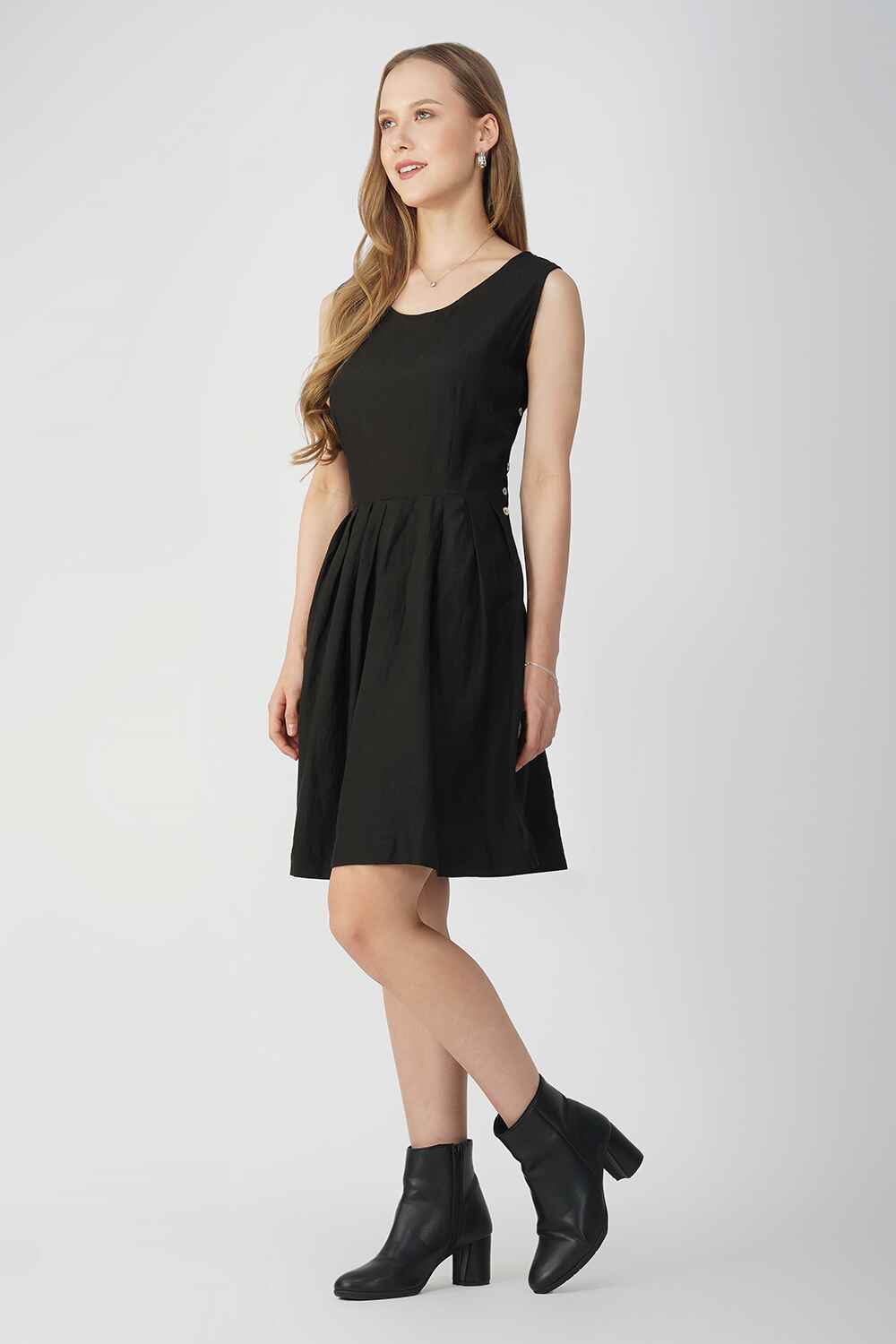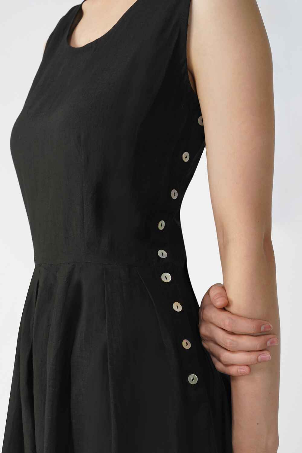 Embrace the charm of understated elegance with this black linen cotton dress. Designed for daily comfort, it features a breathable linen-cotton blend that feels soft on the skin. This versatile short dress is easy to style, making it ideal for both laid-back outings and casual gatherings. Its minimalist design and relaxed fit offer a timeless look that suits every wardrobe. The model is wearing size “M” and her height is 5’6″