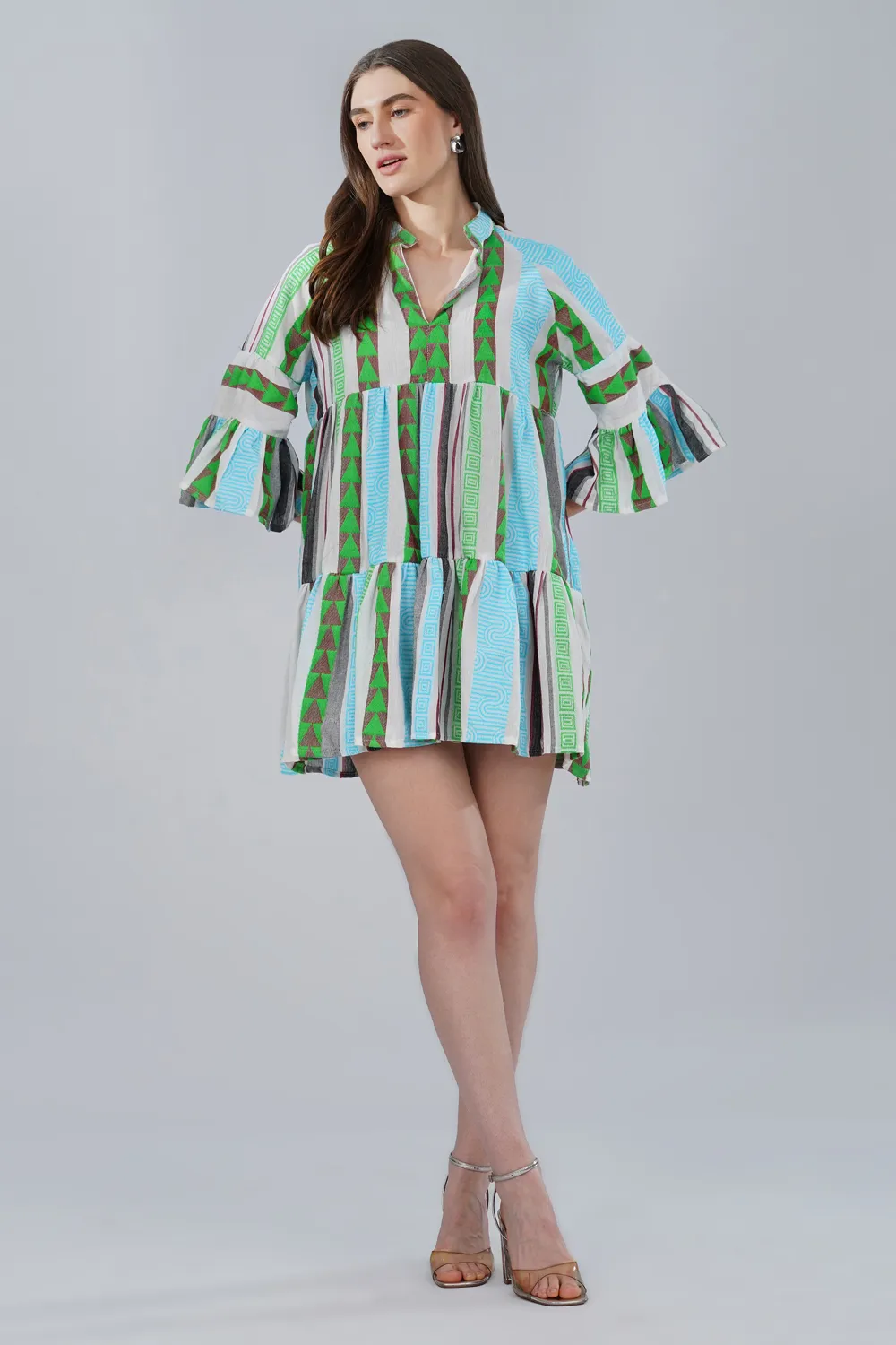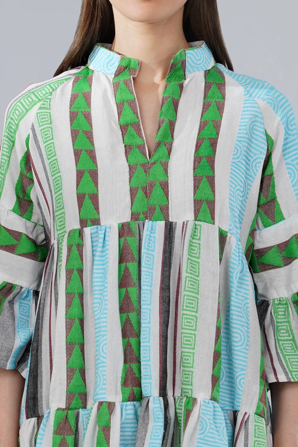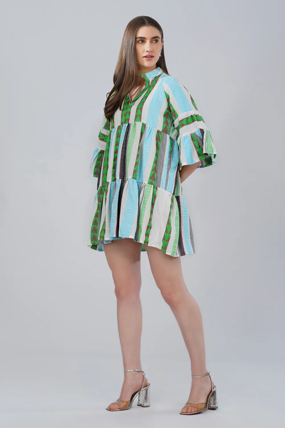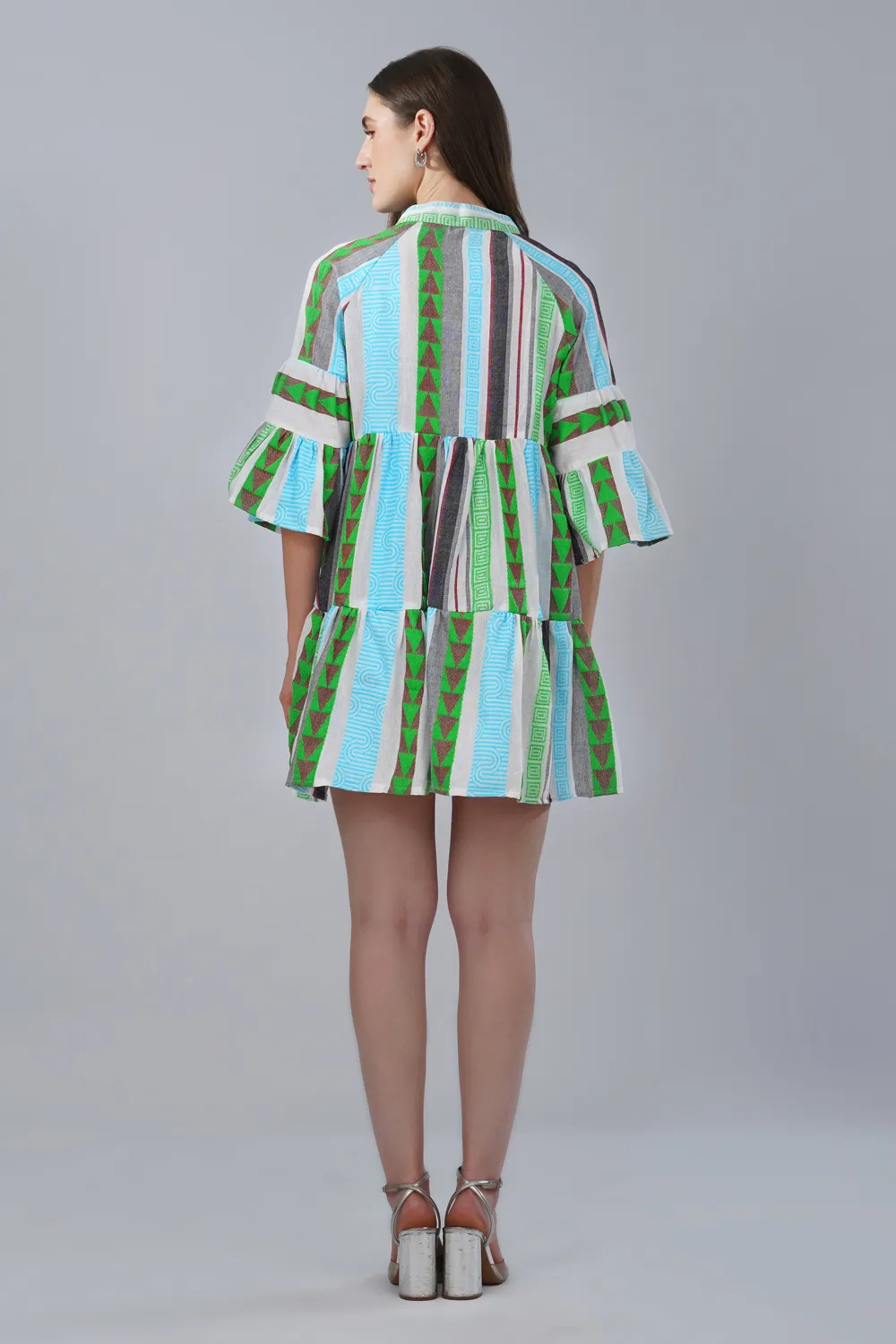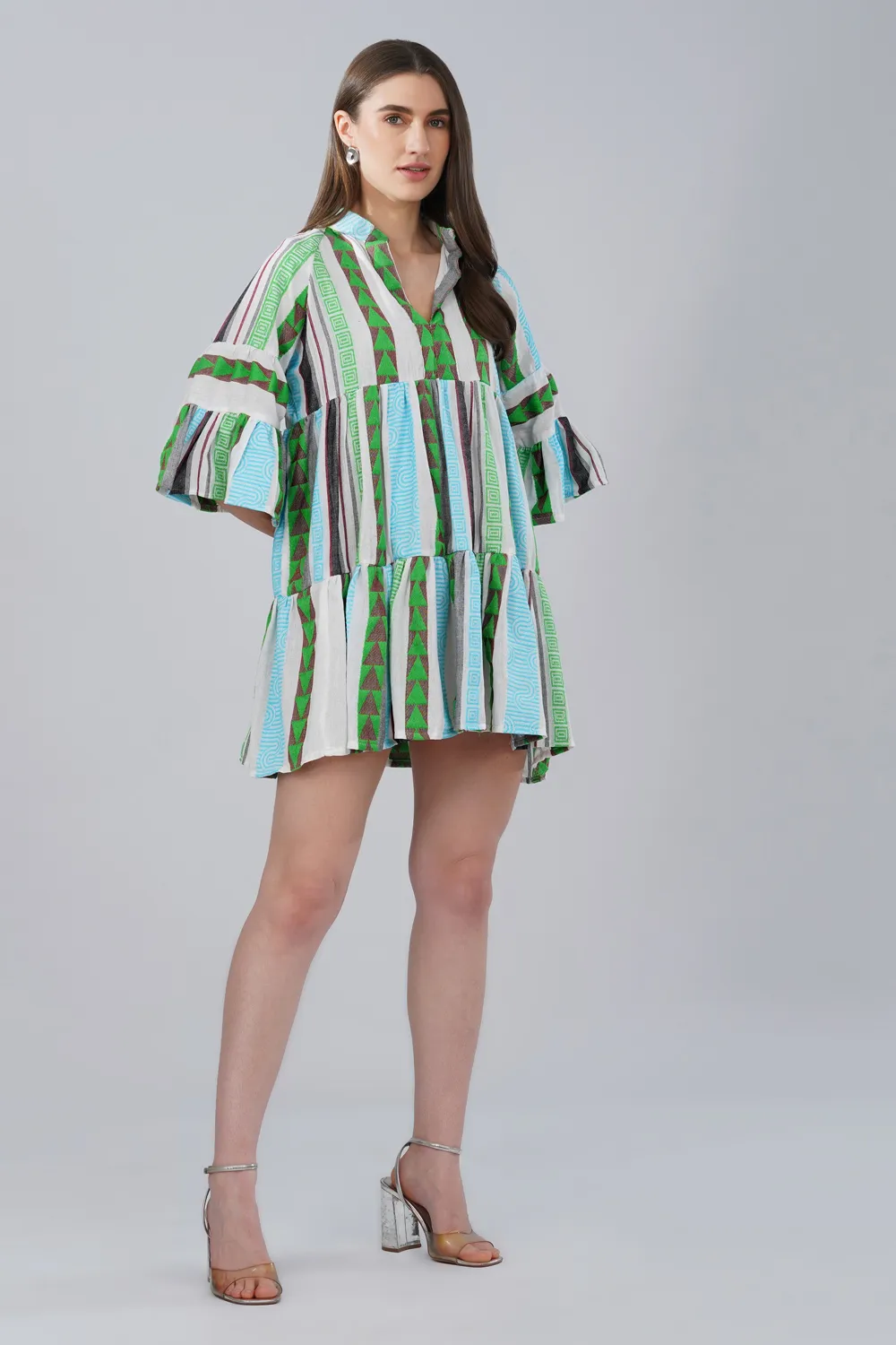 Effortless, breathable, and thoughtfully crafted, this tiered mini dress is made from handwoven cotton jacquard fabric, known for its textured woven pattern and natural comfort. Unlike printed fabrics, the design is woven directly into the fabric, giving the surface depth and a distinctive artisanal character.