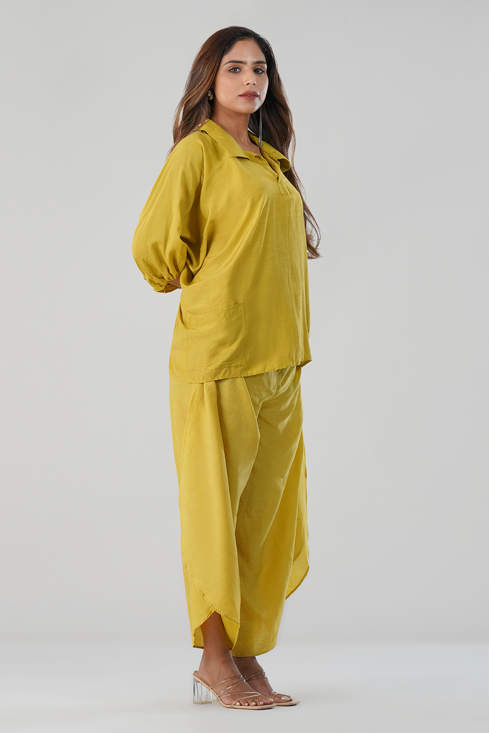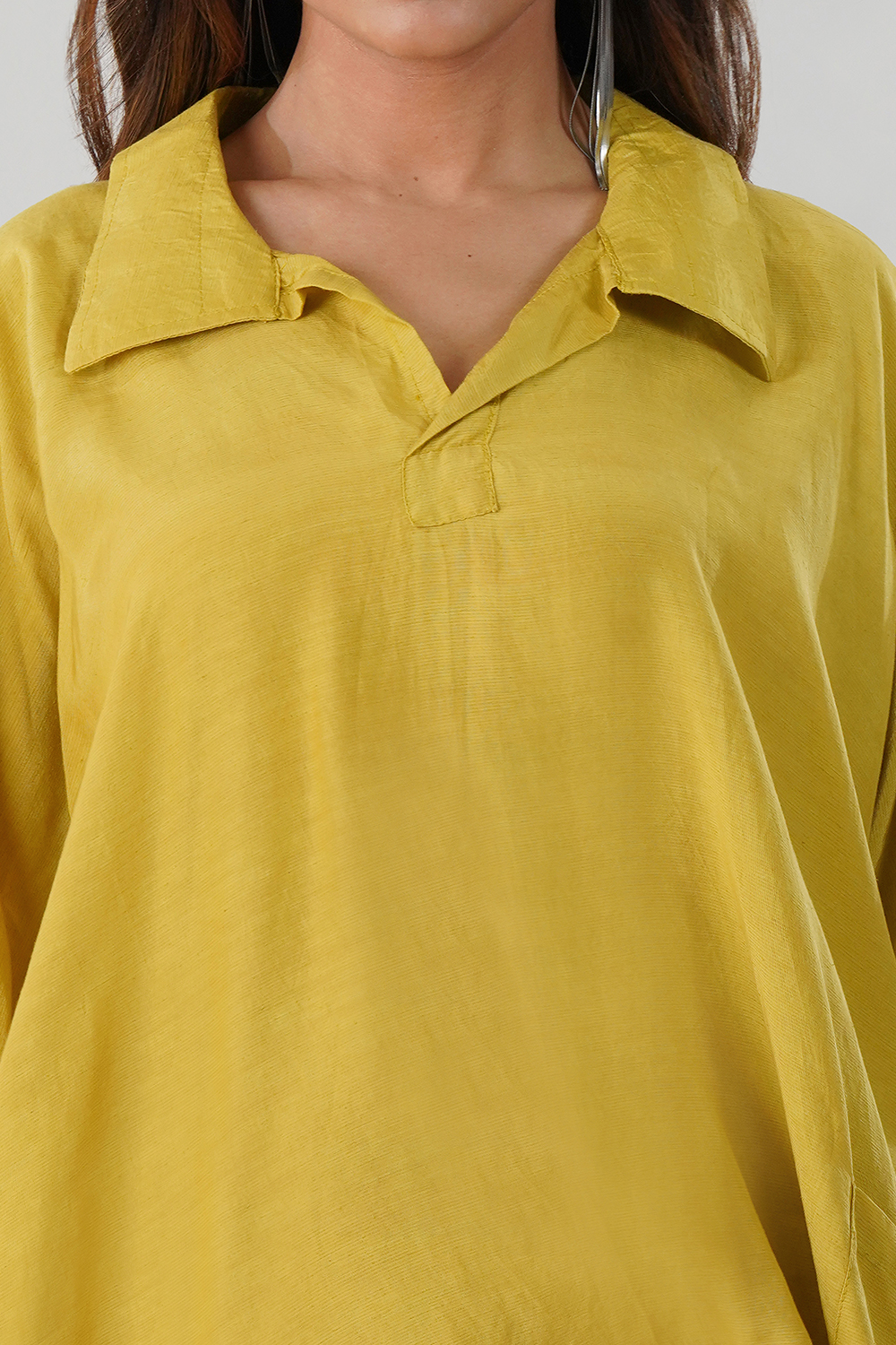 A relaxed, loose-fit top with a soft collar and ¾ puff sleeves for a modern drape